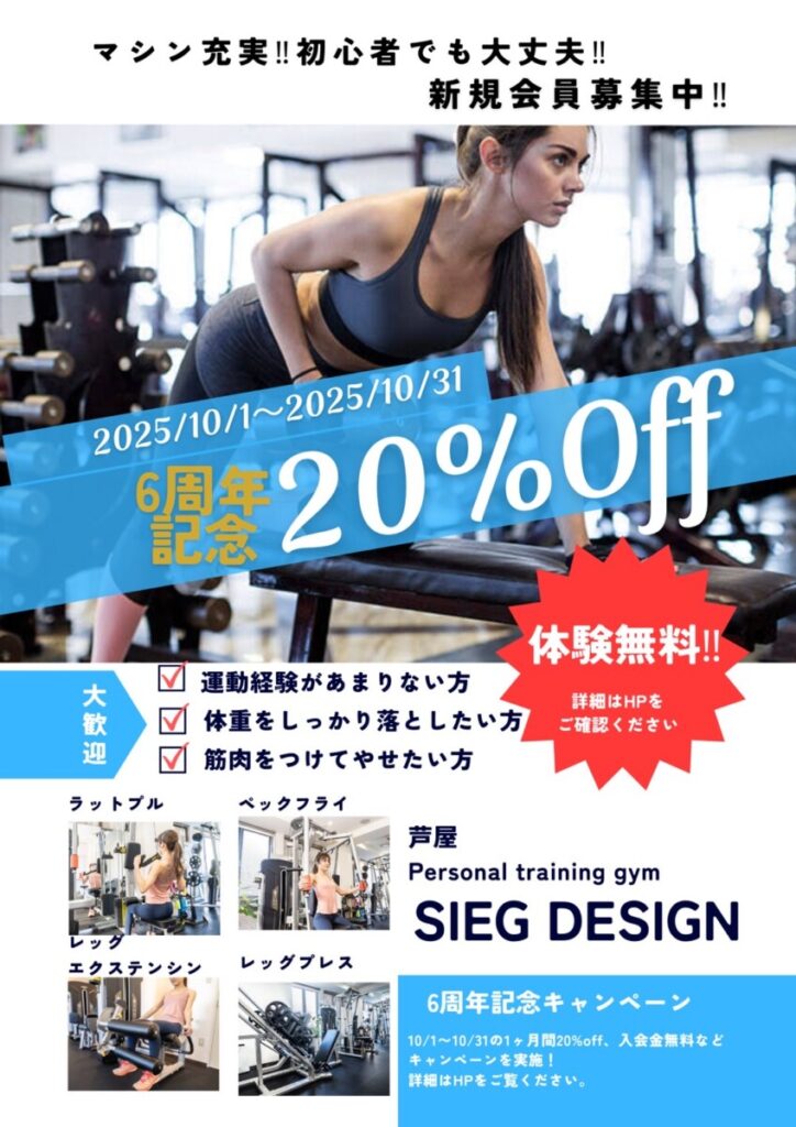 芦屋パーソナルジムSIEGE DESIGN(ジークデザイン)は2019年10月1日にオープンしてから、6周年を迎えることができます。